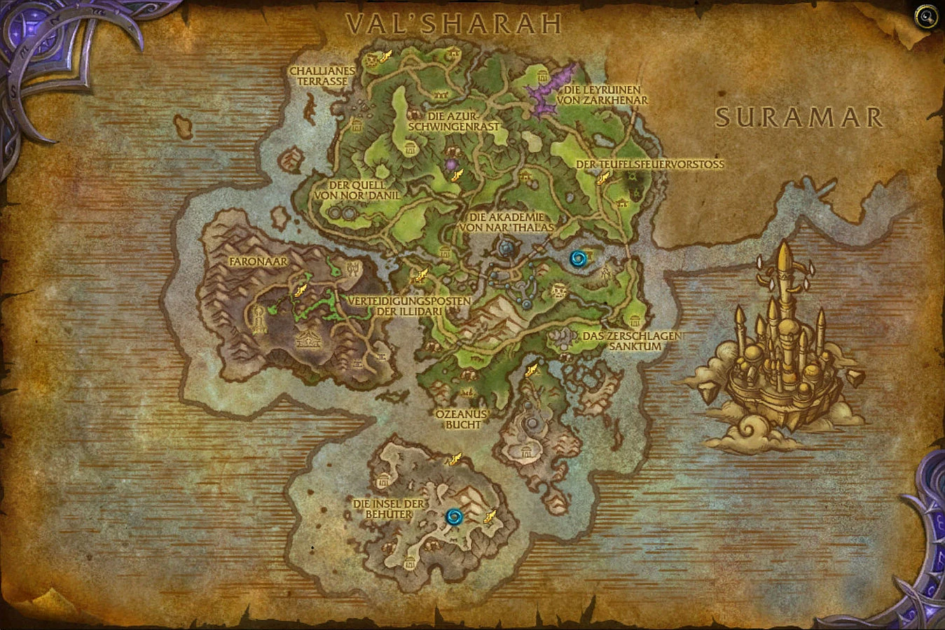 - Ruinen von Nar'thalas / Akademie von Nar'thalas - Die Akademie war das Zentrum magischen Wissens, bevor Königin Azshara Golganneths Gezeitenstein zerbrach, was den Fluch auslöste. Dieser tötete fast alle Elfen und verdammte sie dazu, ewig weiter zu existieren.