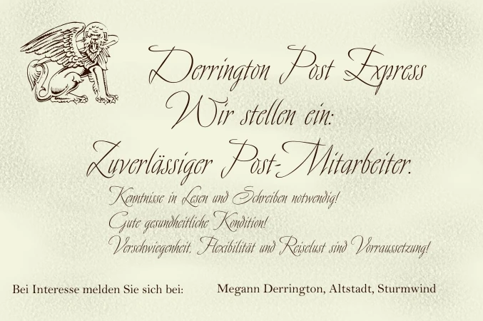 Beim Derrington Post-Express handelte es sich bisher um eine Ein-Frau-Aktion nach Jahren des so bespielens wurde daraus jetzt eine Gilde gemacht Derrington Postexpress (ingame). Es wird nach Lust und Laune gespielt. Wobei jedoch jederzeit (wenn anwesend oder per Post) ein Auftrag aufgegeben werden kann IC und dies auch IC ausgespielt werden kann.