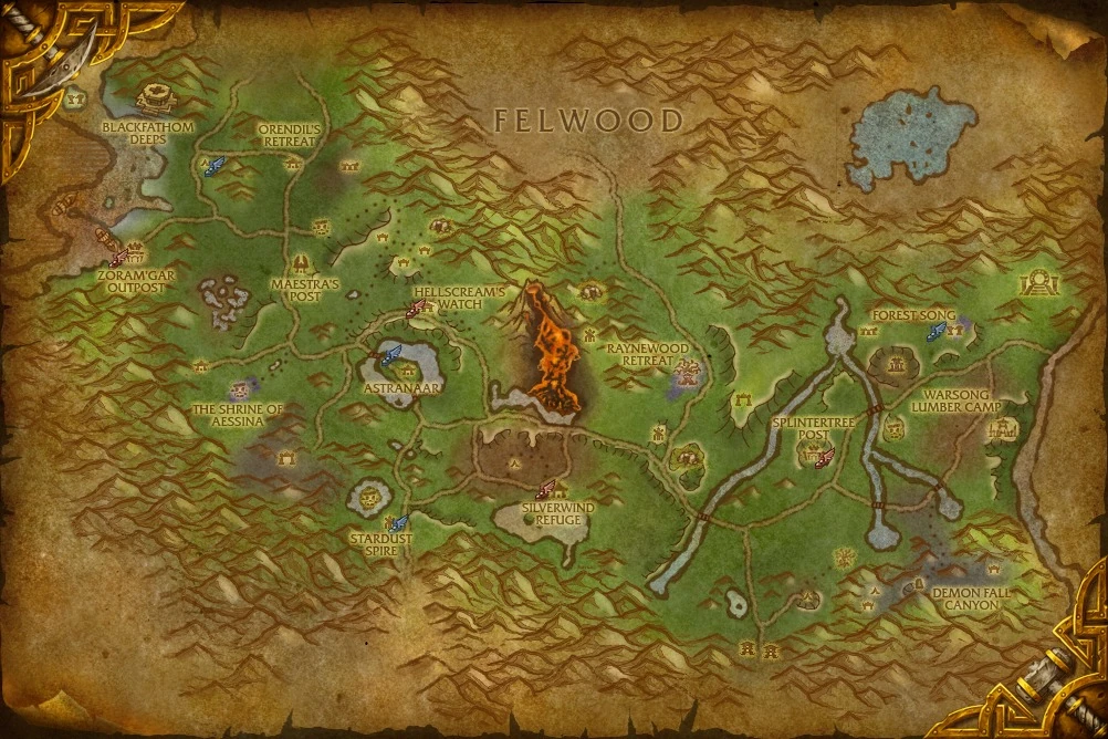 Dieser Nachtelfenwald ist eine große, ungezähmte Wildnis, der die Horde ihren Willen aufzuzwingen trachtet, sowohl politisch wie auch spirituell. Die Horde hat eine starke Präsenz in den Ländern nördlich des Brachlandes aufgebaut und die beiden Außenposten - der Splitterholzposten und der Zoram'gar-Außenposten - wollen ihr zu Ruhm gereichen. [1]